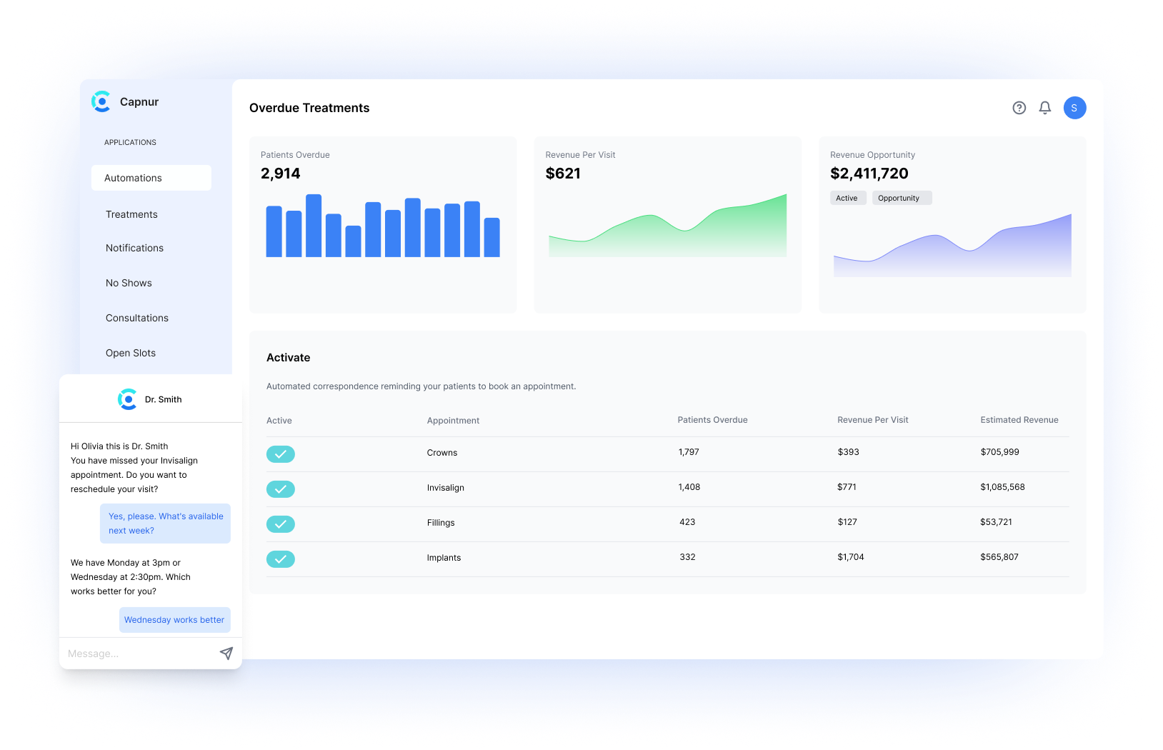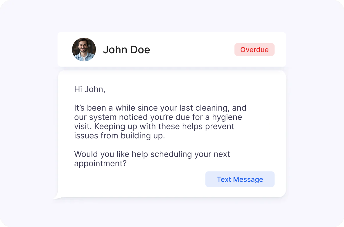 Capnur automatically identifies overdue recalls and unscheduled treatments, then initiates natural, personalized outreach guiding each patient toward getting back on your schedule without staff involvement.